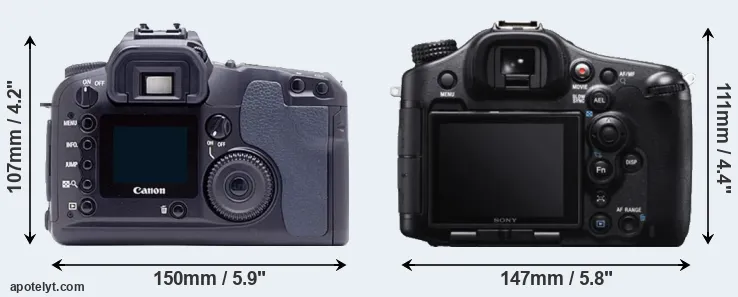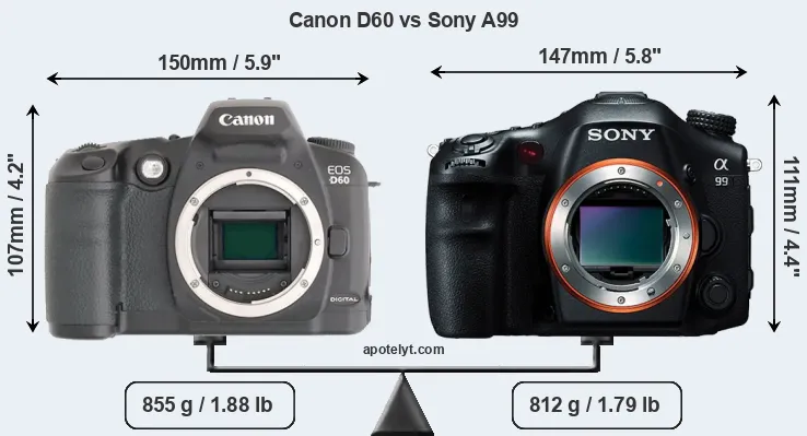 The side-by-side display below illustrates the physical size and weight of the Canon D60 and the Sony A99. The two cameras are presented according to their relative size. Three successive views from the front, the top, and the rear are shown. All size dimensions are rounded to the nearest millimeter.