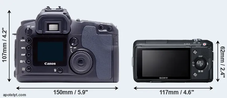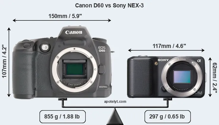 The physical size and weight of the Canon D60 and the Sony NEX-3 are illustrated in the side-by-side display below. The two cameras are presented according to their relative size. Three consecutive perspectives from the front, the top, and the back are available. All width, height and depth dimensions are rounded to the nearest millimeter.