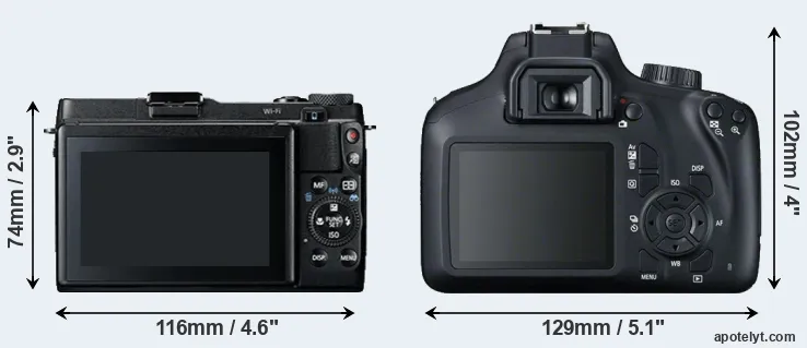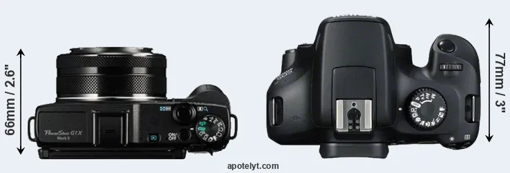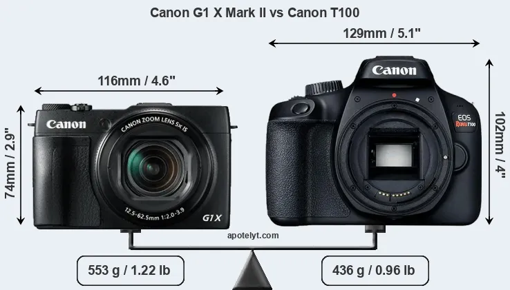 The side-by-side display below illustrates the physical size and weight of the Canon G1 X Mark II and the Canon T100. The two cameras are presented according to their relative size. Three consecutive perspectives from the front, the top, and the back are available. All width, height and depth dimensions are rounded to the nearest millimeter.