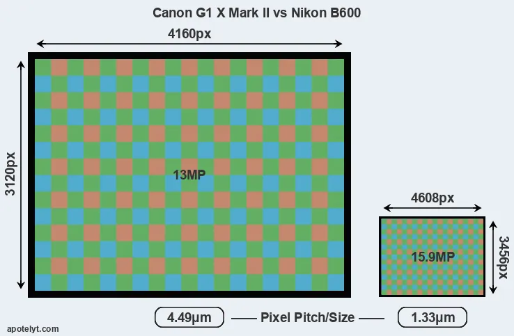 Despite having a smaller sensor, the B600 offers a higher resolution of 15.9 megapixels, compared with 13 MP of the G1X Mark II. This megapixels advantage comes at the cost of a higher pixel density and a smaller size of the individual pixel (with a pixel pitch of 1.33μm versus 4.49μm for the G1X Mark II). However, it should be noted that the B600 is much more recent (by 4 years and 11 months) than the G1X Mark II, and its sensor will have benefitted from technological advances during this time that make it possible to gather light more efficiently. Coming back to sensor resolution, it should be mentioned that the B600 has no anti-alias filter installed, so that it can capture all the detail its sensor resolves.