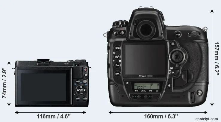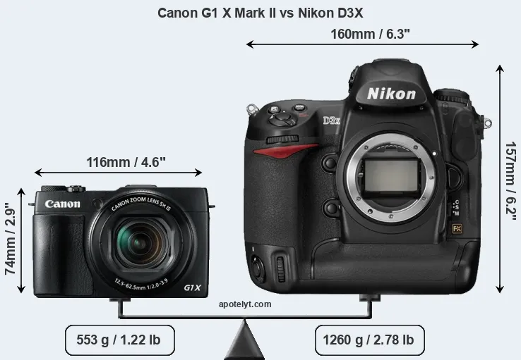 The side-by-side display below illustrates the physical size and weight of the Canon G1 X Mark II and the Nikon D3X. The two cameras are presented according to their relative size. Three consecutive perspectives from the front, the top, and the back are available. All width, height and depth dimensions are rounded to the nearest millimeter.