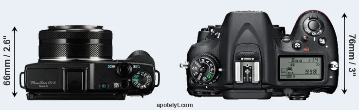 The above size and weight comparisons are to some extent incomplete and possibly misleading, as the G1X Mark II has a lens built in, whereas the D7100 is an interchangeable lens camera that requires a separate lens. Attaching the latter will add extra weight and bulk to the setup. You can compare the optics available for the D7100 and their specifications in the Nikon Lens Catalog.