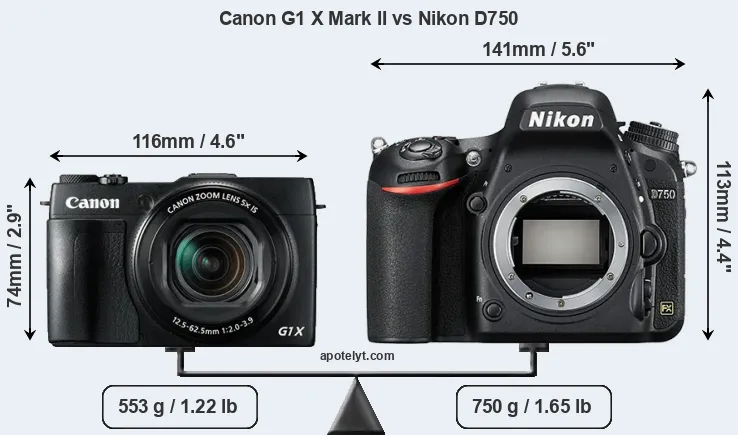 An illustration of the physical size and weight of the Canon G1 X Mark II and the Nikon D750 is provided in the side-by-side display below. The two cameras are presented according to their relative size. Three consecutive perspectives from the front, the top, and the back are available. All width, height and depth measures are rounded to the nearest millimeter.