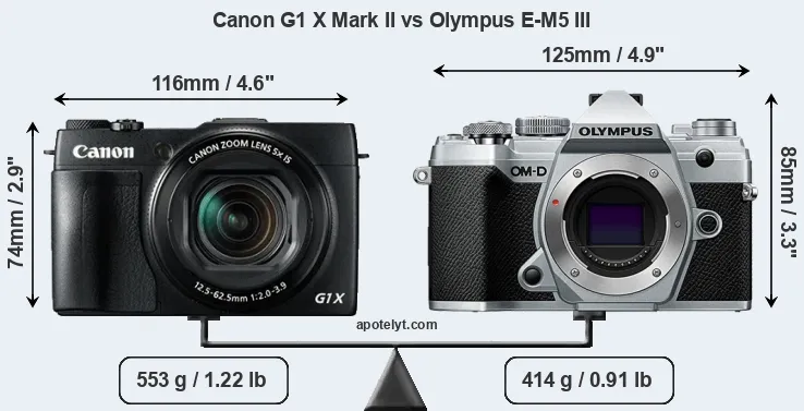 The side-by-side display below illustrates the physical size and weight of the Canon G1 X Mark II and the Olympus E-M5 III. The two cameras are presented according to their relative size. Three consecutive perspectives from the front, the top, and the back are available. All width, height and depth measures are rounded to the nearest millimeter.