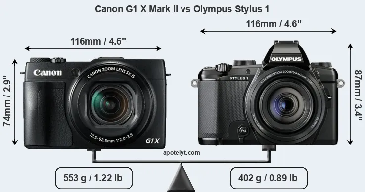 The side-by-side display below illustrates the physical size and weight of the Canon G1 X Mark II and the Olympus Stylus 1. The two cameras are presented according to their relative size. Three consecutive perspectives from the front, the top, and the back are available. All size dimensions are rounded to the nearest millimeter.