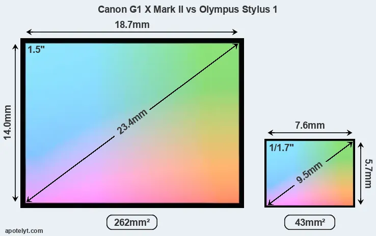 Of the two cameras under consideration, the Canon G1 X Mark II features an 1.5-inch sensor and the Olympus Stylus 1 a 1/1.7-inch sensor. The sensor area in the Stylus 1 is 84 percent smaller. As a result of these sensor size differences, the cameras have a format factor of, respectively, 1.85 and 4.5. Both cameras feature a native aspect ratio (sensor width to sensor height) of 4:3.