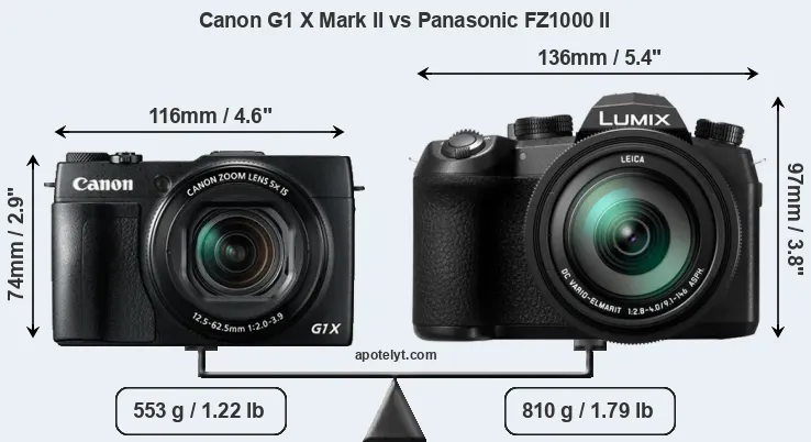 If the front view area (width x height) of the cameras is taken as an aggregate measure of their size, the Panasonic FZ1000 II is considerably larger (54 percent) than the Canon G1 X Mark II. Moreover, the FZ1000 II is substantially heavier (46 percent) than the G1X Mark II. In this context, it is worth noting that neither the G1X Mark II nor the FZ1000 II are weather-sealed.
