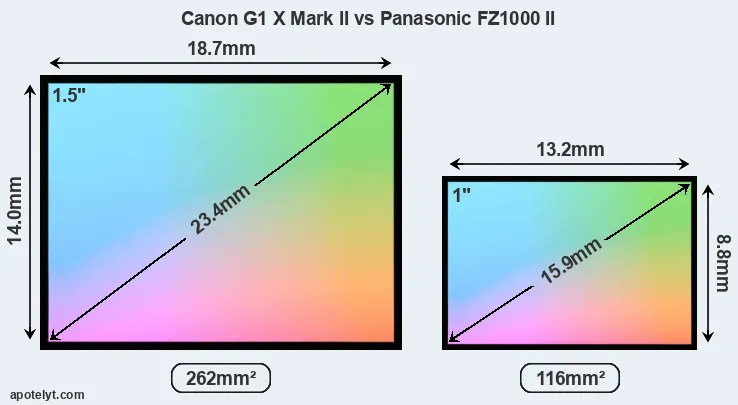Of the two cameras under consideration, the Canon G1 X Mark II features an 1.5-inch sensor and the Panasonic FZ1000 II an one-inch sensor. The sensor area in the FZ1000 II is 56 percent smaller. As a result of these sensor size differences, the cameras have a format factor of, respectively, 1.85 and 2.7. The sensor in the G1X Mark II has a native 4:3 aspect ratio, while the one in the FZ1000 II offers a 3:2 aspect.