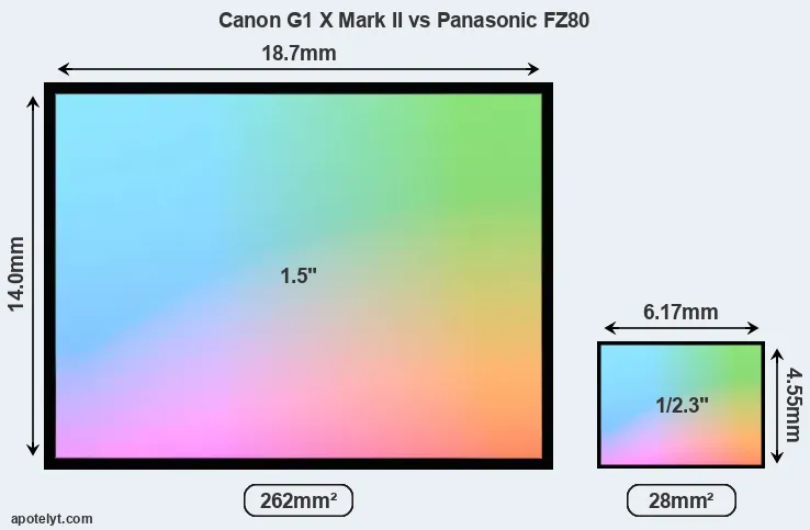 Of the two cameras under consideration, the Canon G1 X Mark II features an 1.5-inch sensor and the Panasonic FZ80 a 1/2.3-inch sensor. The sensor area in the FZ80 is 89 percent smaller. As a result of these sensor size differences, the cameras have a format factor of, respectively, 1.85 and 5.6. Both cameras feature a native aspect ratio (sensor width to sensor height) of 4:3.