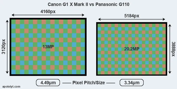 Despite having a smaller sensor, the G110 offers a higher resolution of 20.2 megapixels, compared with 13 MP of the G1X Mark II. This megapixels advantage comes at the cost of a higher pixel density and a smaller size of the individual pixel (with a pixel pitch of 3.34μm versus 4.49μm for the G1X Mark II). However, it should be noted that the G110 is much more recent (by 6 years and 4 months) than the G1X Mark II, and its sensor will have benefitted from technological advances during this time that make it possible to gather light more efficiently. Coming back to sensor resolution, it should be mentioned that the G110 has no anti-alias filter installed, so that it can capture all the detail its sensor resolves.