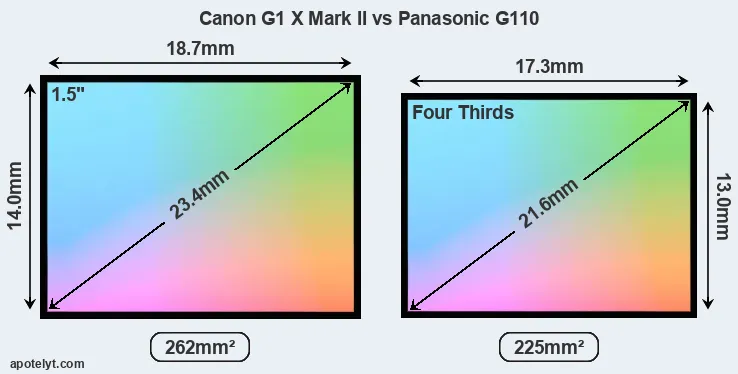 Of the two cameras under consideration, the Canon G1 X Mark II features an 1.5-inch sensor and the Panasonic G110 a Four Thirds sensor. The sensor area in the G110 is 14 percent smaller. As a result of these sensor size differences, the cameras have a format factor of, respectively, 1.85 and 2.0. Both cameras feature a native aspect ratio (sensor width to sensor height) of 4:3.