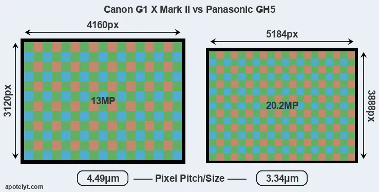 Despite having a smaller sensor, the GH5 offers a higher resolution of 20.2 megapixels, compared with 13 MP of the G1X Mark II. This megapixels advantage comes at the cost of a higher pixel density and a smaller size of the individual pixel (with a pixel pitch of 3.34μm versus 4.49μm for the G1X Mark II). However, it should be noted that the GH5 is much more recent (by 2 years and 10 months) than the G1X Mark II, and its sensor will have benefitted from technological advances during this time that make it possible to gather light more efficiently. Coming back to sensor resolution, it should be mentioned that the GH5 has no anti-alias filter installed, so that it can capture all the detail its sensor resolves.