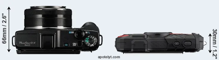 The side-by-side display below illustrates the physical size and weight of the Canon G1 X Mark II and the Ricoh WG-60. The two cameras are presented according to their relative size. Three consecutive perspectives from the front, the top, and the back are available. All width, height and depth measures are rounded to the nearest millimeter.
