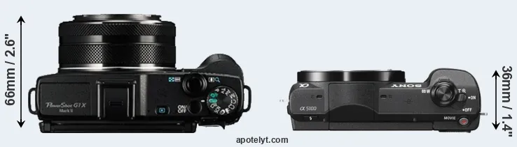 The side-by-side display below illustrates the physical size and weight of the Canon G1 X Mark II and the Sony A5100. The two cameras are presented according to their relative size. Three successive views from the front, the top, and the rear are shown. All width, height and depth dimensions are rounded to the nearest millimeter.