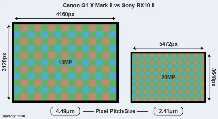 Despite having a smaller sensor, the RX10 II offers a higher resolution of 20 megapixels, compared with 13 MP of the G1X Mark II. This megapixels advantage comes at the cost of a higher pixel density and a smaller size of the individual pixel (with a pixel pitch of 2.41μm versus 4.49μm for the G1X Mark II). However, it should be noted that the RX10 II is a somewhat more recent model (by 1 year and 3 months) than the G1X Mark II, and its sensor might have benefitted from technological advances during this time that partly offset its pixel-size disadvantage.