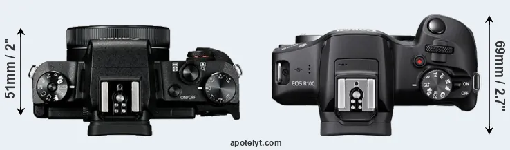 The side-by-side display below illustrates the physical size and weight of the Canon G1 X Mark III and the Canon R100. The two cameras are presented according to their relative size. Three consecutive perspectives from the front, the top, and the back are available. All width, height and depth measures are rounded to the nearest millimeter.