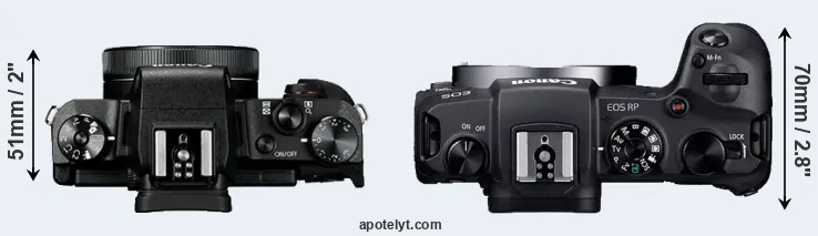 If the front view area (width x height) of the cameras is taken as an aggregate measure of their size, the Canon RP is notably larger (26 percent) than the Canon G1 X Mark III. It is worth mentioning in this context that the G1X Mark III is splash and dust resistant, while the RP does not feature any corresponding weather-sealing.