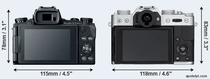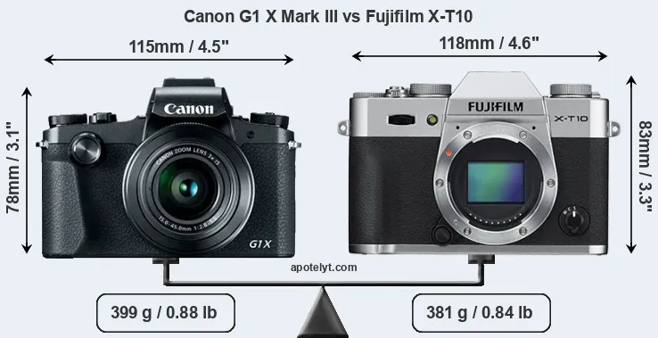 If the front view area (width x height) of the cameras is taken as an aggregate measure of their size, the Fujifilm X-T10 is notably larger (9 percent) than the Canon G1 X Mark III. It is worth mentioning in this context that the G1X Mark III is splash and dust resistant, while the X-T10 does not feature any corresponding weather-sealing.