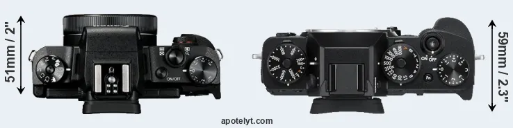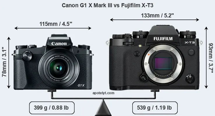 The side-by-side display below illustrates the physical size and weight of the Canon G1 X Mark III and the Fujifilm X-T3. The two cameras are presented according to their relative size. Three successive views from the front, the top, and the rear are shown. All width, height and depth measures are rounded to the nearest millimeter.