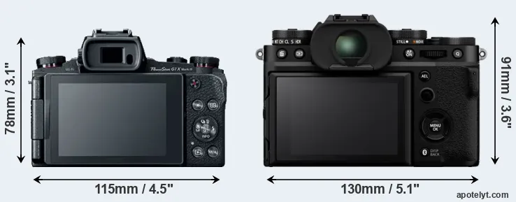 If the front view area (width x height) of the cameras is taken as an aggregate measure of their size, the Fujifilm X-T5 is notably larger (32 percent) than the Canon G1 X Mark III. In this context, it is worth noting that both cameras are splash and dust-proof and can, hence, be used in inclement weather conditions or harsh environments.