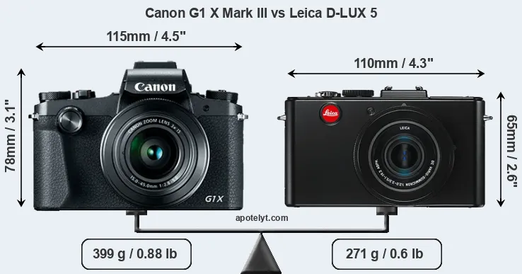 The physical size and weight of the Canon G1 X Mark III and the Leica D-LUX 5 are illustrated in the side-by-side display below. The two cameras are presented according to their relative size. Three consecutive perspectives from the front, the top, and the back are available. All width, height and depth dimensions are rounded to the nearest millimeter.