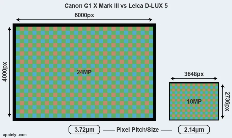 With 24MP, the G1X Mark III offers a higher resolution than the D-LUX 5 (10MP), but the G1X Mark III nevertheless has larger individual pixels (pixel pitch of 3.72μm versus 2.14μm for the D-LUX 5) due to its larger sensor. Moreover, the G1X Mark III is a much more recent model (by 7 years) than the D-LUX 5, and its sensor will have benefitted from technological advances during this time that further enhance the light gathering capacity of its pixels.