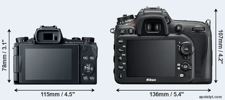 The above size and weight comparisons are to some extent incomplete and possibly misleading, as the G1X Mark III has a lens built in, whereas the D7200 is an interchangeable lens camera that requires a separate lens. Attaching the latter will add extra weight and bulk to the setup. You can compare the optics available for the D7200 and their specifications in the Nikon Lens Catalog.