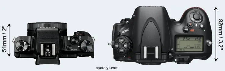 If the front view area (width x height) of the cameras is taken as an aggregate measure of their size, the Nikon D800 is considerably larger (100 percent) than the Canon G1 X Mark III. In this context, it is worth noting that both cameras are splash and dust-proof and can, hence, be used in inclement weather conditions or harsh environments.
