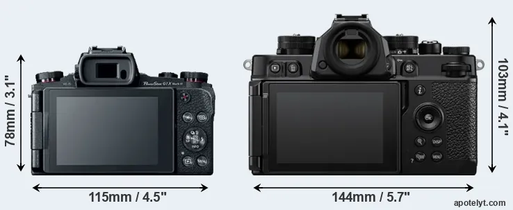 If the front view area (width x height) of the cameras is taken as an aggregate measure of their size, the Nikon Zf is considerably larger (65 percent) than the Canon G1 X Mark III. In this context, it is worth noting that both cameras are splash and dust-proof and can, hence, be used in inclement weather conditions or harsh environments.