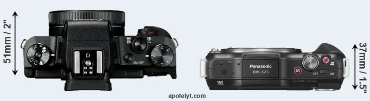 If the front view area (width x height) of the cameras is taken as an aggregate measure of their size, the Panasonic GF5 is notably smaller (19 percent) than the Canon G1 X Mark III. It is worth mentioning in this context that the G1X Mark III is splash and dust resistant, while the GF5 does not feature any corresponding weather-sealing.