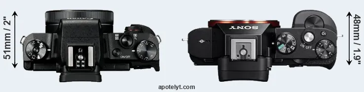 If the front view area (width x height) of the cameras is taken as an aggregate measure of their size, the Sony A7 is notably larger (33 percent) than the Canon G1 X Mark III. In this context, it is worth noting that both cameras are splash and dust-proof and can, hence, be used in inclement weather conditions or harsh environments.