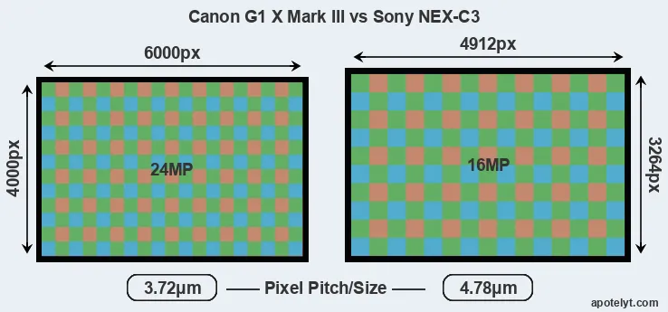 Despite having a smaller sensor, the Canon G1 X Mark III offers a higher resolution of 24 megapixels, compared with 16 MP of the Sony NEX-C3. This megapixels advantage comes at the cost of a higher pixel density and a smaller size of the individual pixel (with a pixel pitch of 3.72μm versus 4.78μm for the NEX-C3). However, it should be noted that the G1X Mark III is much more recent (by 6 years and 4 months) than the NEX-C3, and its sensor will have benefitted from technological advances during this time that make it possible to gather light more efficiently.