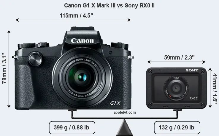 The side-by-side display below illustrates the physical size and weight of the Canon G1 X Mark III and the Sony RX0 II. The two cameras are presented according to their relative size. Three successive views from the front, the top, and the rear are shown. All width, height and depth measures are rounded to the nearest millimeter.