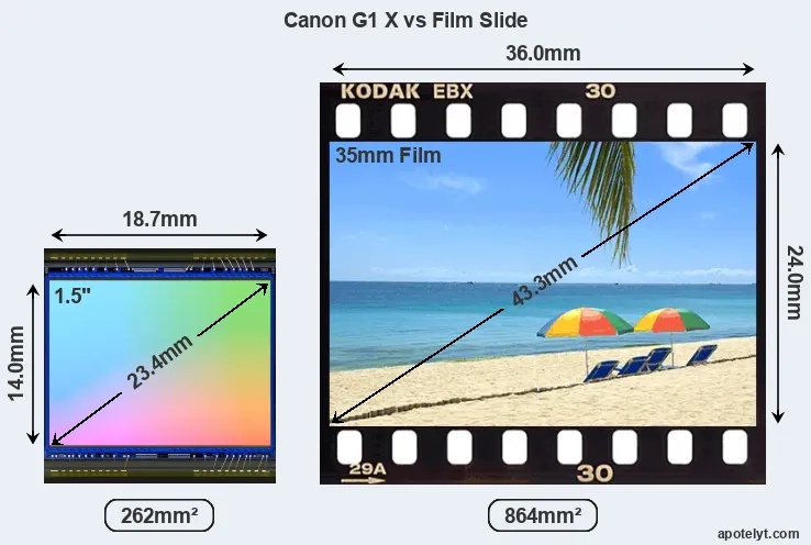 The Canon G1 X features an 1.5-inch sensor and has a format factor (sometimes also referred to as "crop factor") of 1.85. Within the spectrum of camera sensors, this places the Canon G1 X among the medium-sized sensor cameras that aim to strike a balance between image quality and portability.