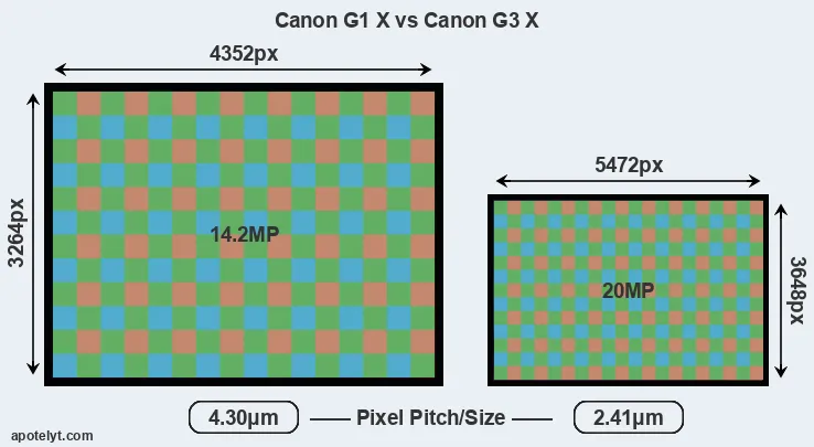 Despite having a smaller sensor, the G3X offers a higher resolution of 20 megapixels, compared with 14.2 MP of the G1X. This megapixels advantage comes at the cost of a higher pixel density and a smaller size of the individual pixel (with a pixel pitch of 2.41μm versus 4.30μm for the G1X). However, it should be noted that the G3X is much more recent (by 3 years and 5 months) than the G1X, and its sensor will have benefitted from technological advances during this time that make it possible to gather light more efficiently.