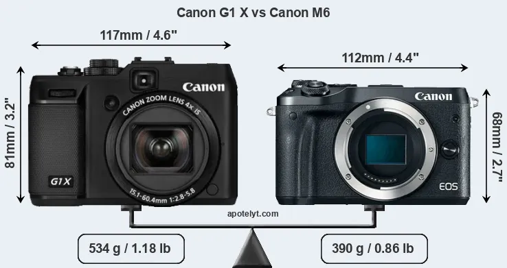 The side-by-side display below illustrates the physical size and weight of the Canon G1 X and the Canon M6. The two cameras are presented according to their relative size. Three successive views from the front, the top, and the rear are shown. All width, height and depth measures are rounded to the nearest millimeter.