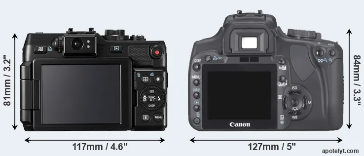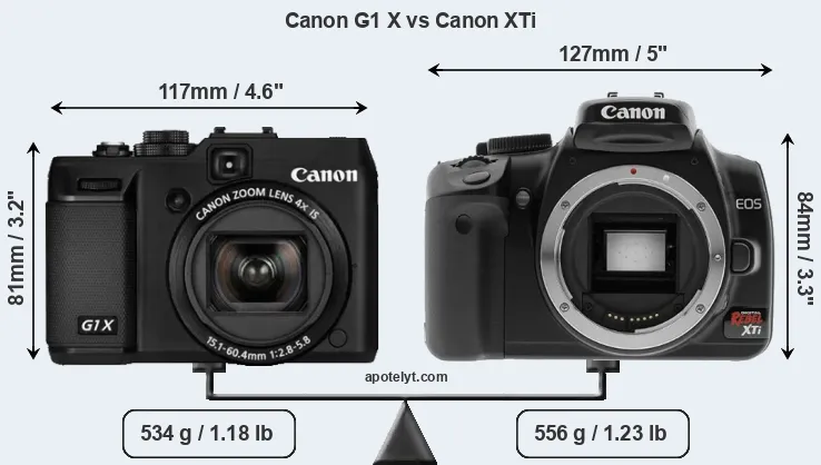The physical size and weight of the Canon G1 X and the Canon XTi are illustrated in the side-by-side display below. The two cameras are presented according to their relative size. Three successive views from the front, the top, and the rear are shown. All size dimensions are rounded to the nearest millimeter.