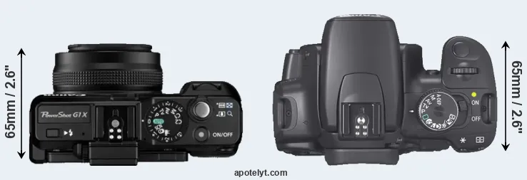 The Canon PowerShot G1 X and the Canon EOS Rebel XTi (labelled Canon 400D in some countries) are two digital cameras that were officially introduced, respectively, in January 2012 and August 2006. The G1X is a fixed lens compact, while the XTi is a DSLR. The cameras are based on an 1.5-inch (G1X) and an APS-C (XTi) sensor. The G1X has a resolution of 14.2 megapixels, whereas the XTi provides 10.1 MP.