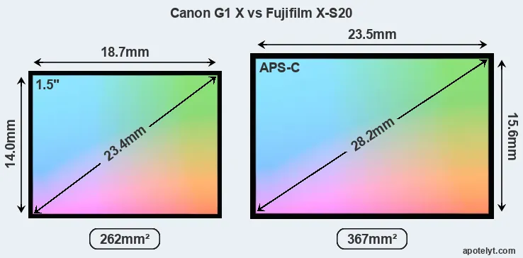 Of the two cameras under consideration, the Canon G1 X features an 1.5-inch sensor and the Fujifilm X-S20 an APS-C sensor. The sensor area in the X-S20 is 40 percent bigger. As a result of these sensor size differences, the cameras have a format factor of, respectively, 1.85 and 1.5. The sensor in the G1X has a native 4:3 aspect ratio, while the one in the X-S20 offers a 3:2 aspect.