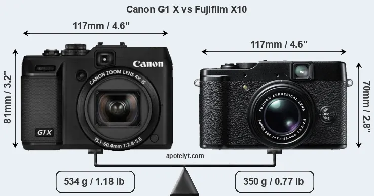 The physical size and weight of the Canon G1 X and the Fujifilm X10 are illustrated in the side-by-side display below. The two cameras are presented according to their relative size. Three consecutive perspectives from the front, the top, and the back are available. All size dimensions are rounded to the nearest millimeter.