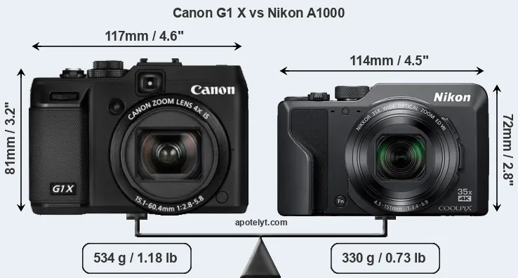 An illustration of the physical size and weight of the Canon G1 X and the Nikon A1000 is provided in the side-by-side display below. The two cameras are presented according to their relative size. Three consecutive perspectives from the front, the top, and the back are available. All width, height and depth measures are rounded to the nearest millimeter.