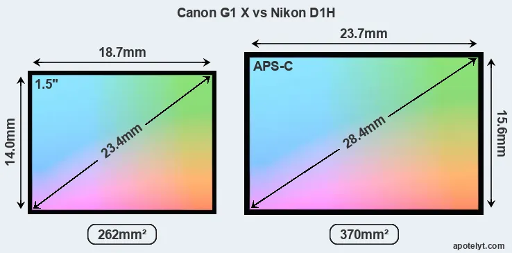 Of the two cameras under consideration, the Canon G1 X features an 1.5-inch sensor and the Nikon D1H an APS-C sensor. The sensor area in the D1H is 41 percent bigger. As a result of these sensor size differences, the cameras have a format factor of, respectively, 1.85 and 1.5. The sensor in the G1X has a native 4:3 aspect ratio, while the one in the D1H offers a 3:2 aspect.