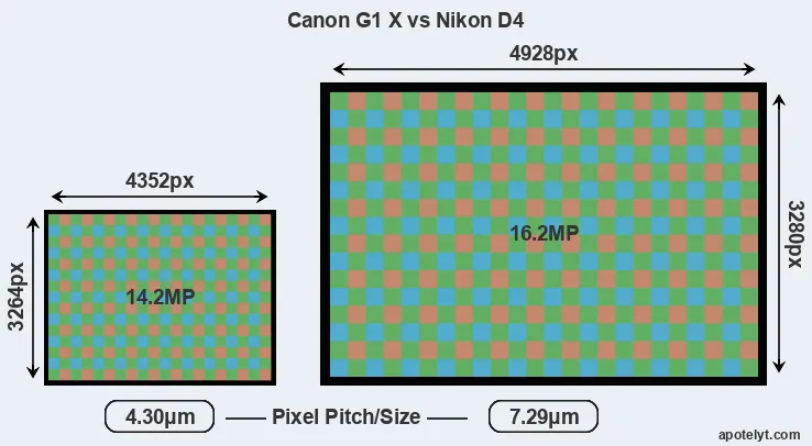 With 16.2MP, the D4 offers a higher resolution than the G1X (14.2MP), but the D4 nevertheless has larger individual pixels (pixel pitch of 7.29μm versus 4.30μm for the G1X) due to its larger sensor. It is noteworthy in this context that the two cameras were released in close succession, so that their sensors are from the same technological generation.