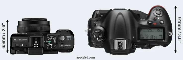 The physical size and weight of the Canon G1 X and the Nikon D4 are illustrated in the side-by-side display below. The two cameras are presented according to their relative size. Three consecutive perspectives from the front, the top, and the back are available. All width, height and depth dimensions are rounded to the nearest millimeter.