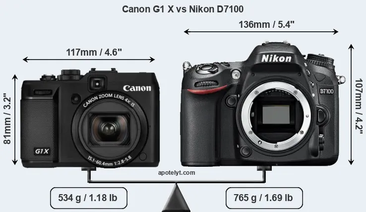 The side-by-side display below illustrates the physical size and weight of the Canon G1 X and the Nikon D7100. The two cameras are presented according to their relative size. Three successive views from the front, the top, and the rear are shown. All width, height and depth measures are rounded to the nearest millimeter.