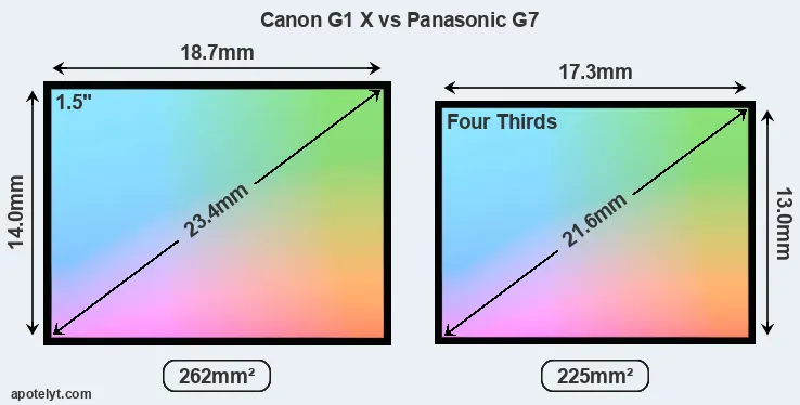 Of the two cameras under consideration, the Canon G1 X features an 1.5-inch sensor and the Panasonic G7 a Four Thirds sensor. The sensor area in the G7 is 14 percent smaller. As a result of these sensor size differences, the cameras have a format factor of, respectively, 1.85 and 2.0. Both cameras feature a native aspect ratio (sensor width to sensor height) of 4:3.