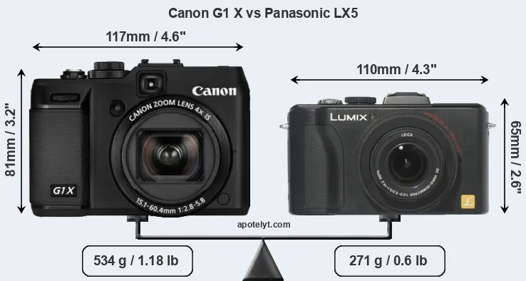 The physical size and weight of the Canon G1 X and the Panasonic LX5 are illustrated in the side-by-side display below. The two cameras are presented according to their relative size. Three consecutive perspectives from the front, the top, and the back are available. All width, height and depth dimensions are rounded to the nearest millimeter.