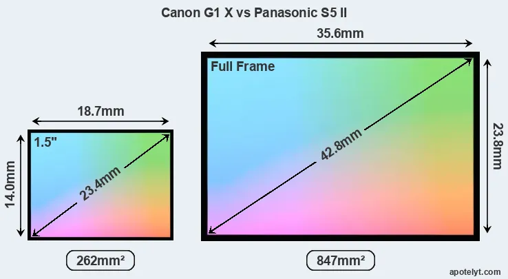 Of the two cameras under consideration, the Canon G1 X features an 1.5-inch sensor and the Panasonic S5 II a full frame sensor. The sensor area in the S5 II is 223 percent bigger. As a result of these sensor size differences, the cameras have a format factor of, respectively, 1.85 and 1.0. The sensor in the G1X has a native 4:3 aspect ratio, while the one in the S5 II offers a 3:2 aspect.