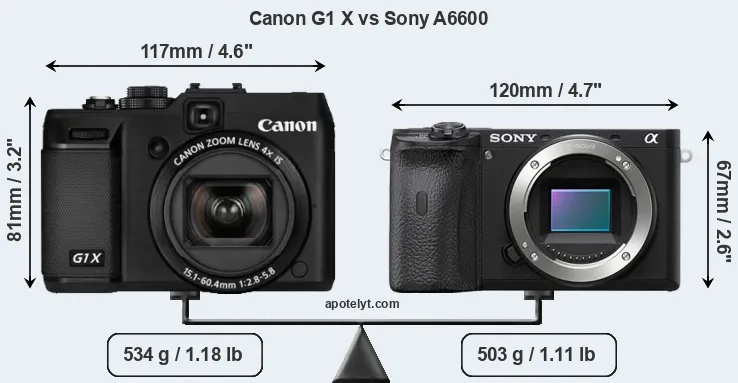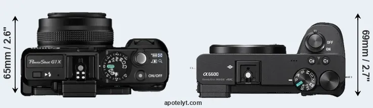 The physical size and weight of the Canon G1 X and the Sony A6600 are illustrated in the side-by-side display below. The two cameras are presented according to their relative size. Three consecutive perspectives from the front, the top, and the back are available. All width, height and depth measures are rounded to the nearest millimeter.