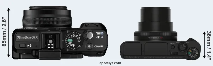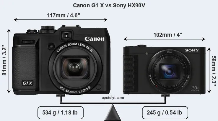The side-by-side display below illustrates the physical size and weight of the Canon G1 X and the Sony HX90V. The two cameras are presented according to their relative size. Three successive views from the front, the top, and the rear are shown. All size dimensions are rounded to the nearest millimeter.